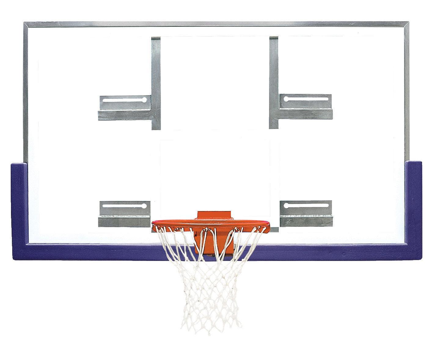 Make the transition… Go from old fan-shaped steel or glass backboards to popular 42" x 72" rectangular glass backboards normally without modification or relocation of your existing wall or ceiling support structures • The 35" wide x 20" high rear structure mounting pattern is the standard in the industry for most fan-shaped gym backboards and structures • Unconditional lifetime warranty.