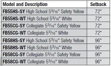 These are the heaviest Bison goalposts…Choose 96" or 72" setback • 48" ground bury • 5-9/16" O.D. schedule 40 pipe is bent then powder coated • All Bison gooseneck goalposts feature Bison's exclusive PerfectGoal design for precise vertical and horizontal alignment and uncommon ease of installation • 4-1/2" steel tube crossbar and 20' long, 2-3/8" diameter aluminum uprights • Order FB10EXT to increase upright height from 20' to 30' • Use with FB55S ground sleeves if desired • Ships in four pieces plus hardware per goal • Sold in pairs but available individually • Order solid color goalpost padding or custom graphic padding separately • See chart for approximate shipping weights.