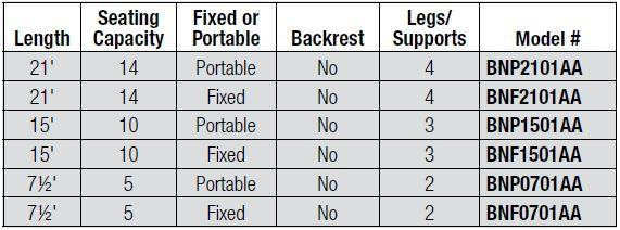 Benches are available as either in-ground fixed models or wide-base, freestanding portables…but these benches do not have a backrest • Bison player benches have 100% welded aluminum support structure • 21' length for fourteen player capacity, 15' for ten players or 7½' for five players • Four 2" square supports on 21', three supports on 15' and two supports on 7½' • 2" x 10" x .08" minimum cross section anodized aluminum seats and backs • Planks have end caps for a finished look without sharp edges • Fixed models require a 30" concrete footing to install in-ground for lasting, safe, weatherproof seating • Portable models are constructed to provide a nearly tip-proof bench to transfer from football field to soccer, baseball or softball fields as seasons change • Portable benches can be used with or without rubber feet provided, can be anchored to ground or can be bolted down to courtside surfaces • Upgrade to color powder coated planks (see BL07SEAT1 for 7-1/2' plank options or BL15SEAT1 for 15' plank options) • Five-year limited warranty on structure, two-year limited warranty on all seats and backs