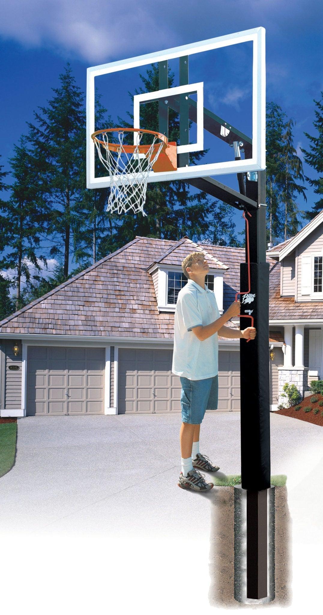You'll see and feel the difference between Bison ZipCrank systems and other manufacturers' systems…Bison uses our experience as a manufacturer of competition grade equipment to offer TruGlass tempered glass backboards that give players a more realistic rebound • Every backboard has an aluminum frame just like those in the gym • The extra heavy poles and front crank style height adjustment are designed to change the height of the breakaway goal from 7-½' to 10' with the turn of the removable crank handle • As an added bonus, Bison ZipCrank systems can be mounted closer to fences, walls or other obstacles than rear height adjustment systems • Lottery Pick includes a 4" pole with 54" clear backboard • All systems include free fitted pole padding • Limited Lifetime warranty (2-year on goal, padding, and height adjustment mechanism)