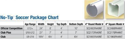 Additional standard No-Tip goal features include extra deep goal depth, competition net, QwikTrack net attachment system, net storage bag and a super thick textured white powder coated finish. New Net Retention Bar keeps net away from rolling ballast wheels for transport. See chart for aluminum opening extrusion shapes and overall goal size options.