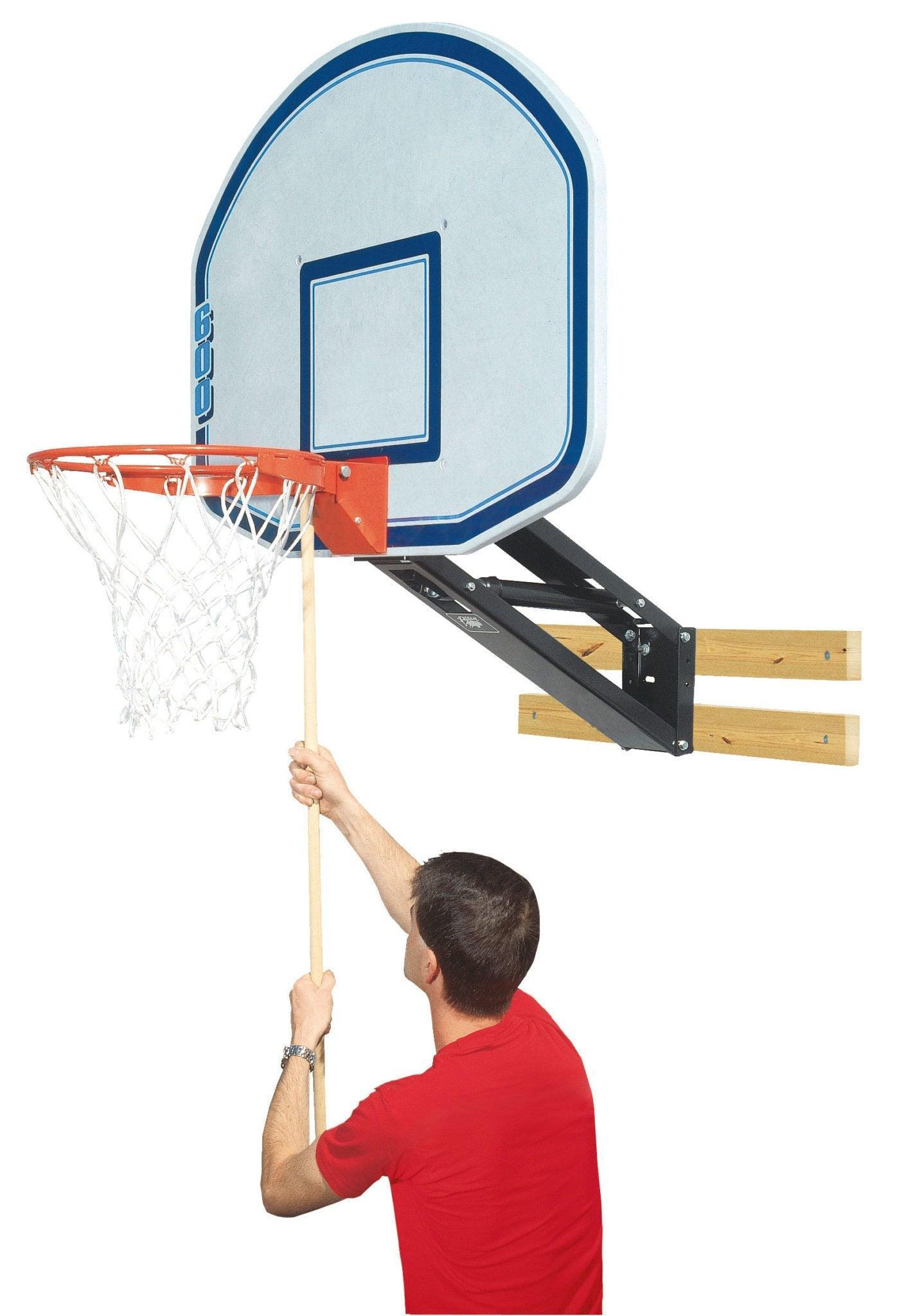 Our lowest cost adjustable wall mount system… Move the goal height from 7-1/2' to 10' in 6" increments with a broom handle from the floor • 36" x 48" molded graphite fan-shaped backboard and official size flex goal are direct mounted to the steel structure for superior backboard durability • QwikChange structure is attached to wall with two struts to spread load on wall • Customer provides wall mounting anchors • Mount indoors/outdoors • 22" safe play area at 10' • One-year limited warranty on system.