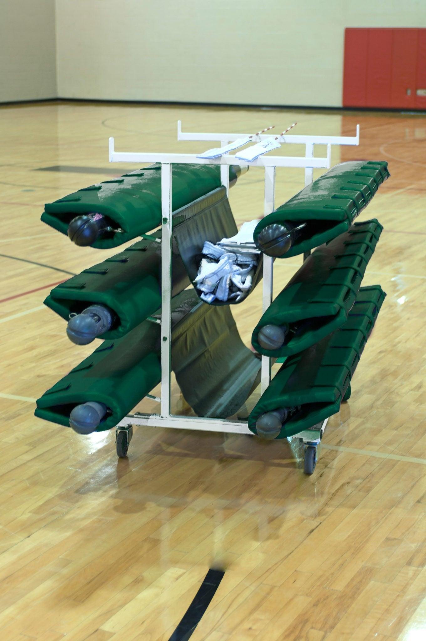 Easy loading, easy transport, easy storage…For all your volleyball program's needs • Safely and securely holds 6 padded posts or up to 12 without padding • Versatile fabric cradle holds nets, antennas, cable covers, balls or padding • Top storage rack can hold officials stand or padding allowing everything you need to be wheeled through a 36" wide door • Sturdy powder coated steel structure with 4" floor friendly, swivel casters for easy movement • Five-year limited warranty. Approx. shipping weight: 90#; Sm. Pkg.