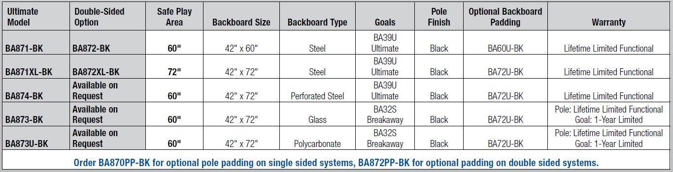 Try the Ultimate on your most demanding outdoor court and you’ll never need to buy another basketball system…From the massive 6" square, 3/16" wall pole and extension arm that buries a full 40" into the ground for incredible stability to the tip of the Ultimate goal that carries an unconditional lifetime warranty, these systems are designed to take the abuse common on today’s playgrounds • All fixed height Ultimate systems feature a full 60" setback for maximum player safety and offer optional backboard and pole padding • Order BA870AXL to upgrade from standard 60" to 72" extension on any system at an additional cost • Backboard choices include 42" x 60" or 42" x 72" steel or 42" x 72" perforated steel with white powder coated finish • Systems with steel boards come standard with Bison’s Ultimate fixed goal • Double sided options on each system are available to get more play for less money • See chart for options.