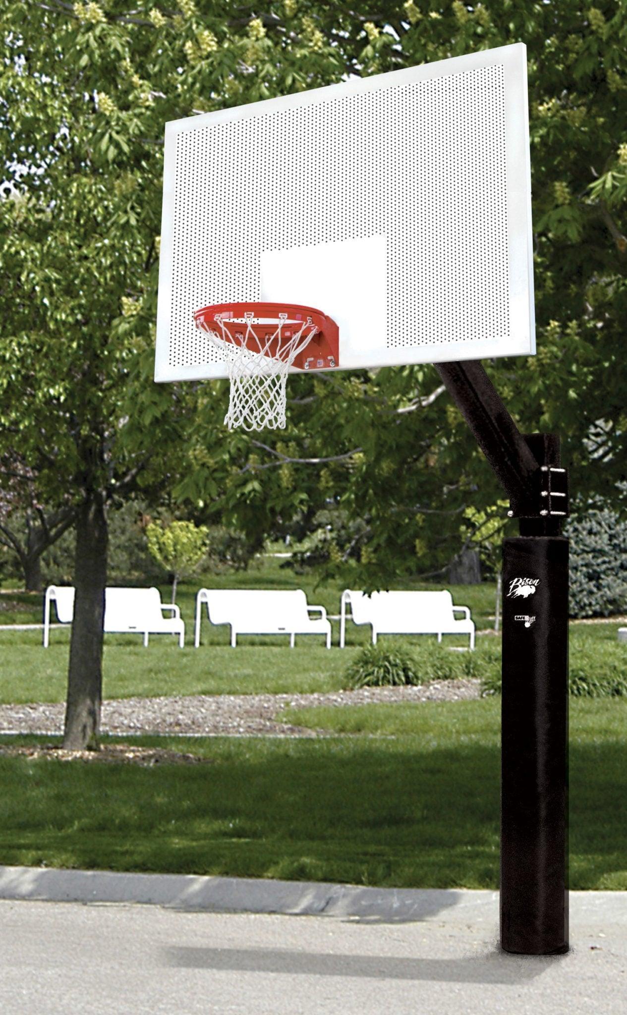 Try the Ultimate on your most demanding outdoor court and you’ll never need to buy another basketball system…From the massive 6" square, 3/16" wall pole and extension arm that buries a full 40" into the ground for incredible stability to the tip of the Ultimate goal that carries an unconditional lifetime warranty, these systems are designed to take the abuse common on today’s playgrounds • All fixed height Ultimate systems feature a full 60" setback for maximum player safety and offer optional backboard and pole padding • Order BA870AXL to upgrade from standard 60" to 72" extension on any system at an additional cost • Backboard choices include 42" x 60" or 42" x 72" steel or 42" x 72" perforated steel with white powder coated finish, 42" x 72" clear tempered glass or 42" x 72" clear unbreakable polycarbonate • Systems with steel boards come standard with Bison’s Ultimate fixed goal • Glass and polycarbonate systems include outdoor breakaway goals • Double sided options are available on each system to get more play for less money