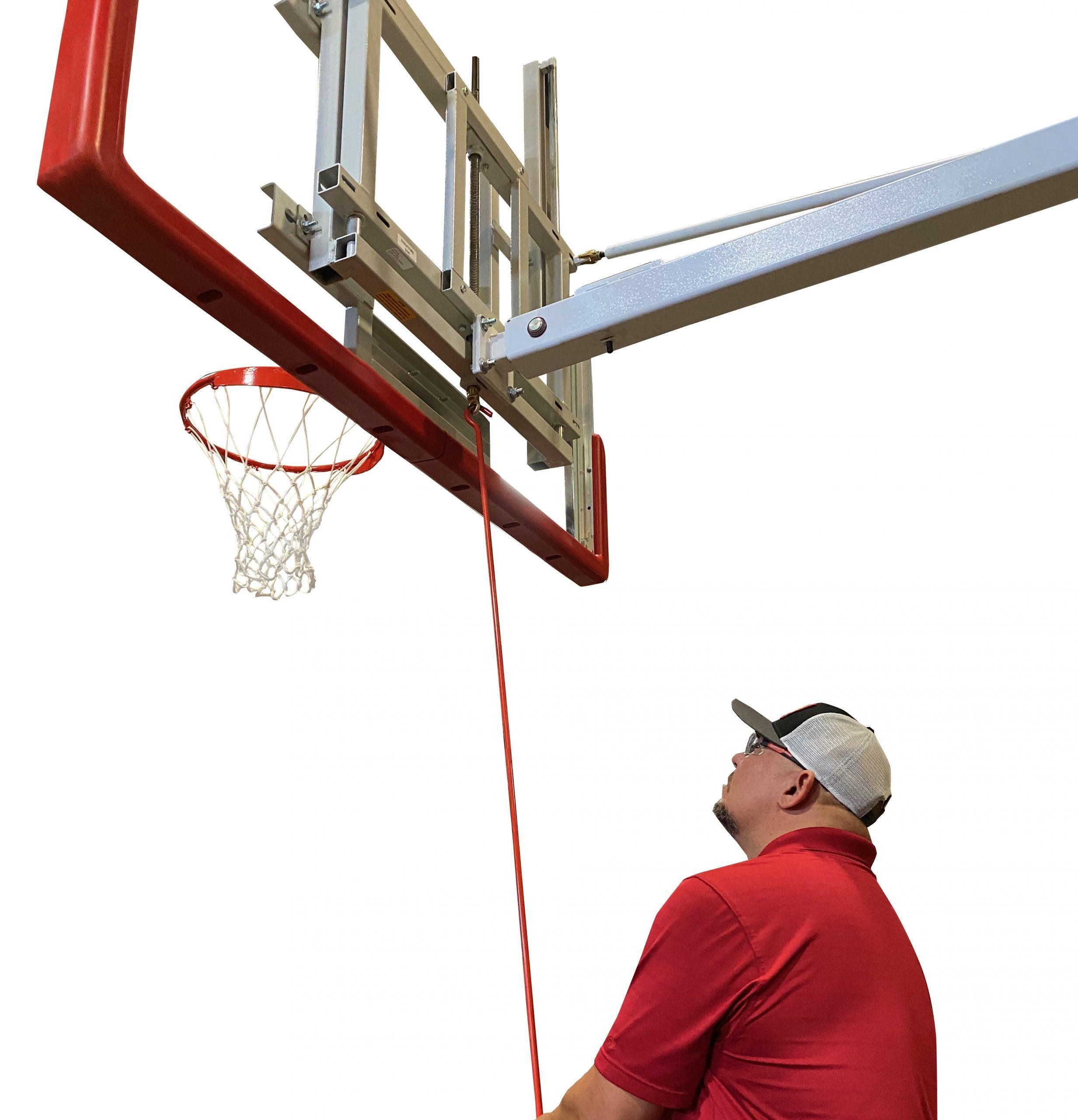 Rim height is easily adjusted straight up and down with an awning style hand crank.